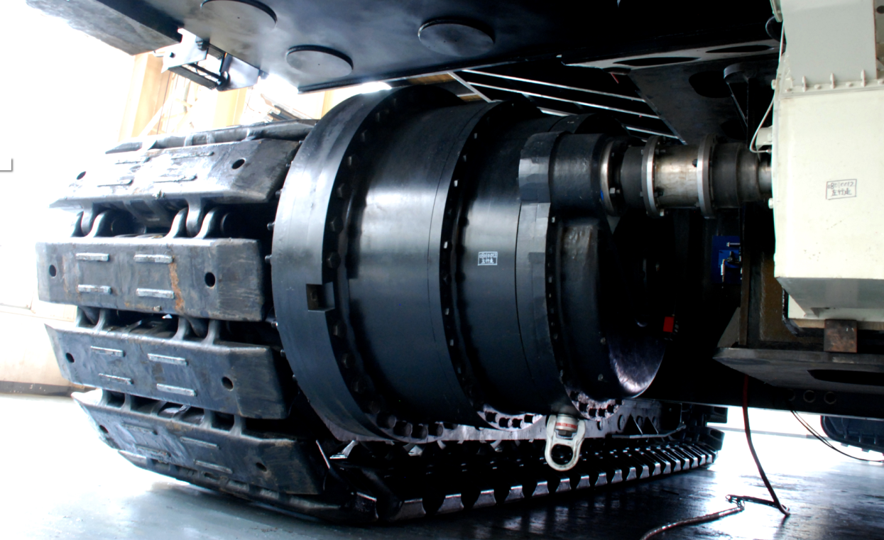行走减速机安装在履带架上,由电机牵引驱动挖掘机的走行;回转减速机安装在回转平台上,为行星结构一级减速机,电机驱动减速机,减速机输出轴通过联接回转立轴齿轮与回转大齿圈啮合,实现挖掘机的回转运动;提升减速机为挖掘机提升机构的主传动设备,用于驱动提升卷筒;推压减速机位于起重臂上,减速机输出轴联接小齿轮与斗杆齿条啮合,驱动齿条左往复运动,与提升机构一起工作实现铲斗挖掘作业。