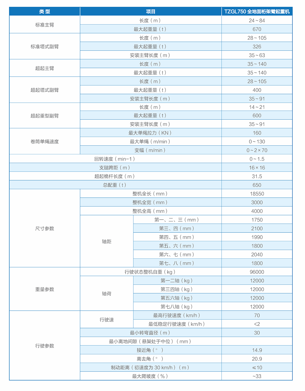 TZL750满足95m中心高3MW双馈风机、100m中心高2.5MW双馈风机、100m中心高3MW直驱风机、140m中心高2.0MW直驱风机安装检修要求。TZL500满足90m及以下2MW至2.5MW风电机组安装检修要求