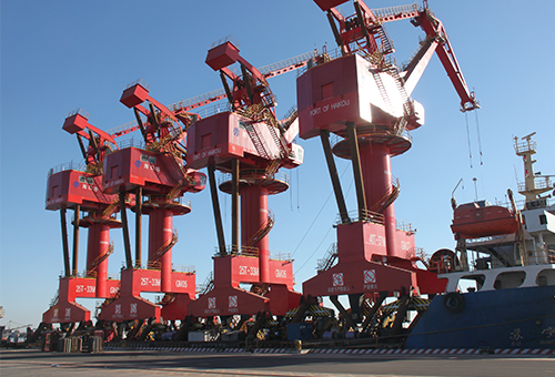 门座起重机是装在沿地面轨道行走的门型底座上的全回转臂架起重机,是码头前沿的通用起重机之一。可以通过滚装发运的方式成套向客户提供所需的门座起重机,包括:四连杆门座起重机、单臂架门座起重机、固定的带斗门机。