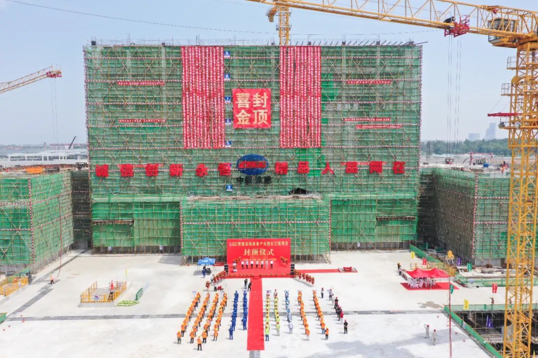 高高矗立,与蓝天白云交相辉映,红布金字的字样显得格外瞩目。经历9个月的紧张高效施工,运营中心主体结构封顶,标志着新园区基础设施及厂房配套项目建设取得了重要的阶段性胜利,为后续施工奠定了坚实的基础。