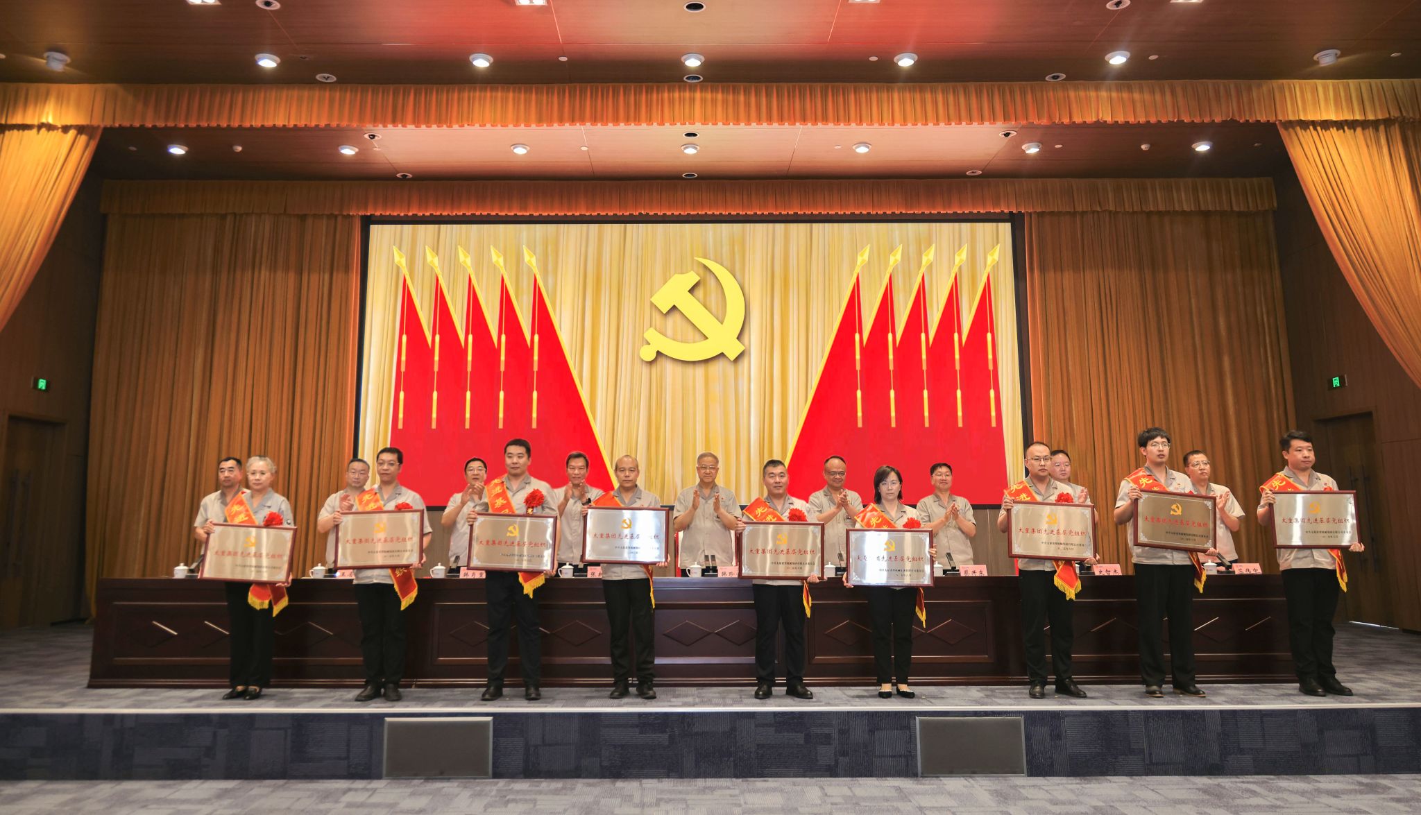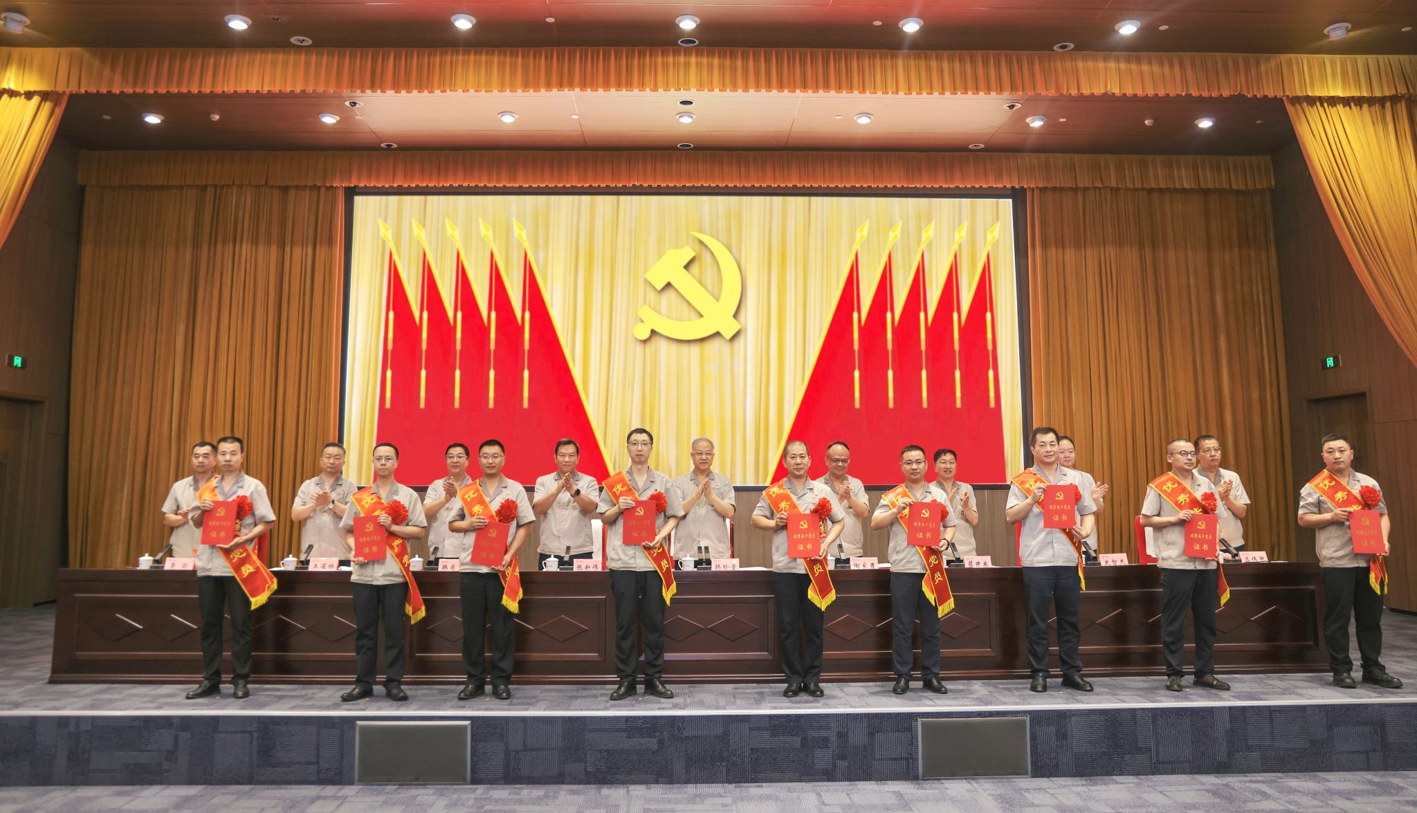 党徽熠熠生辉,旗帜鲜艳似火,大会在庄严的国歌声中拉开帷幕。集团公司党委副书记、副董事长、总经理陶家晋主持会议。公司党委专职副书记、副董事长张新伟宣读集团公司党委《关于表彰优秀共产党员、优秀党务工作者和先进基层党组织的决定》。“两优一先”代表们身披绶带、胸佩红花依次登台,公司领导为他们颁奖。