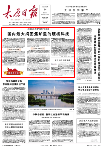 9月14日,太原日报头版头条《喜迎二十大》专栏,刊发文章《太重焦化突破“瓶颈”创效益 国内最大捣固焦炉里的硬核科技》,报道太重集团聚焦“双碳”目标,加快培育能源科技创新领域新路径,从具备制造国际先进水平焦炉机械成套设备能力,到首开“一键炼焦”技术先河,再到研发出全国最大的智能捣固焦炉设备,“核心技术”的自主创新和“卡脖子”问题的逐个攻破,推动了我国焦化装备制造在国际市场上从跟跑、并跑到领跑的跨越。