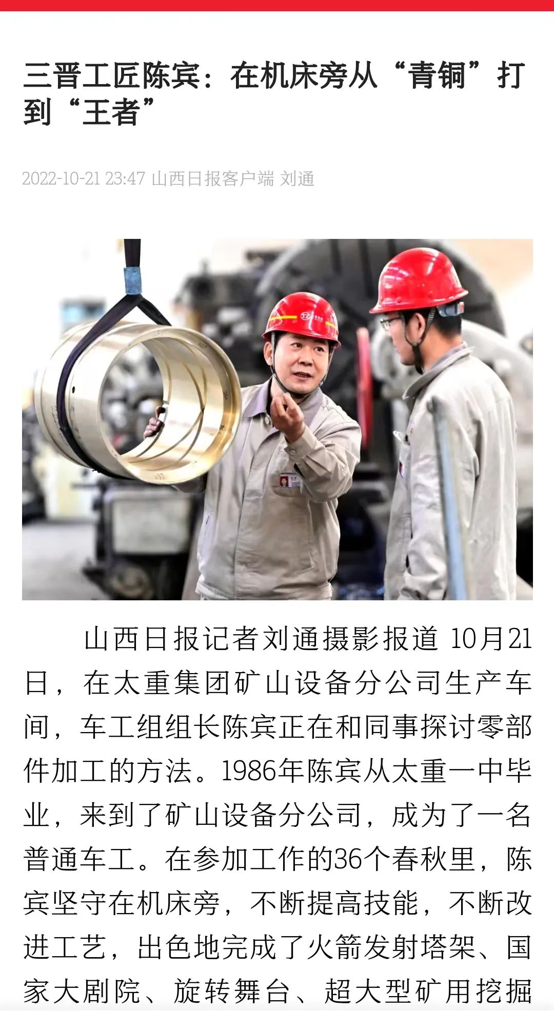 10月21日,山西日报以《三晋工匠陈宾:在机床旁从“青铜”打到“王者”》为题,对太重职工陈宾进行了报道。陈宾36年来潜心钻研、不断创新、精益求精,致力于大型关键零件的精加工任务,成为一名名副其实的“三晋工匠”。