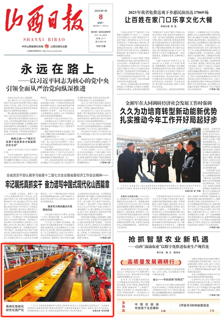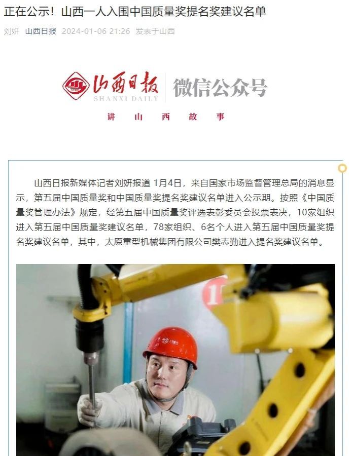 新年伊始,太重高质量发展喜讯频传,山西日报重点关注太重集团加快推进新型工业化塑造发展新优势,头版以《高端化智能化 绿色化国产化》为题,报道太重多个智能化起重机项目和出口项目的火热生产现场。另外,太重职工樊志勤进入第五届中国质量奖提名奖建议名单,为推动建设质量强国,增强质量管理竖立起太重标杆。