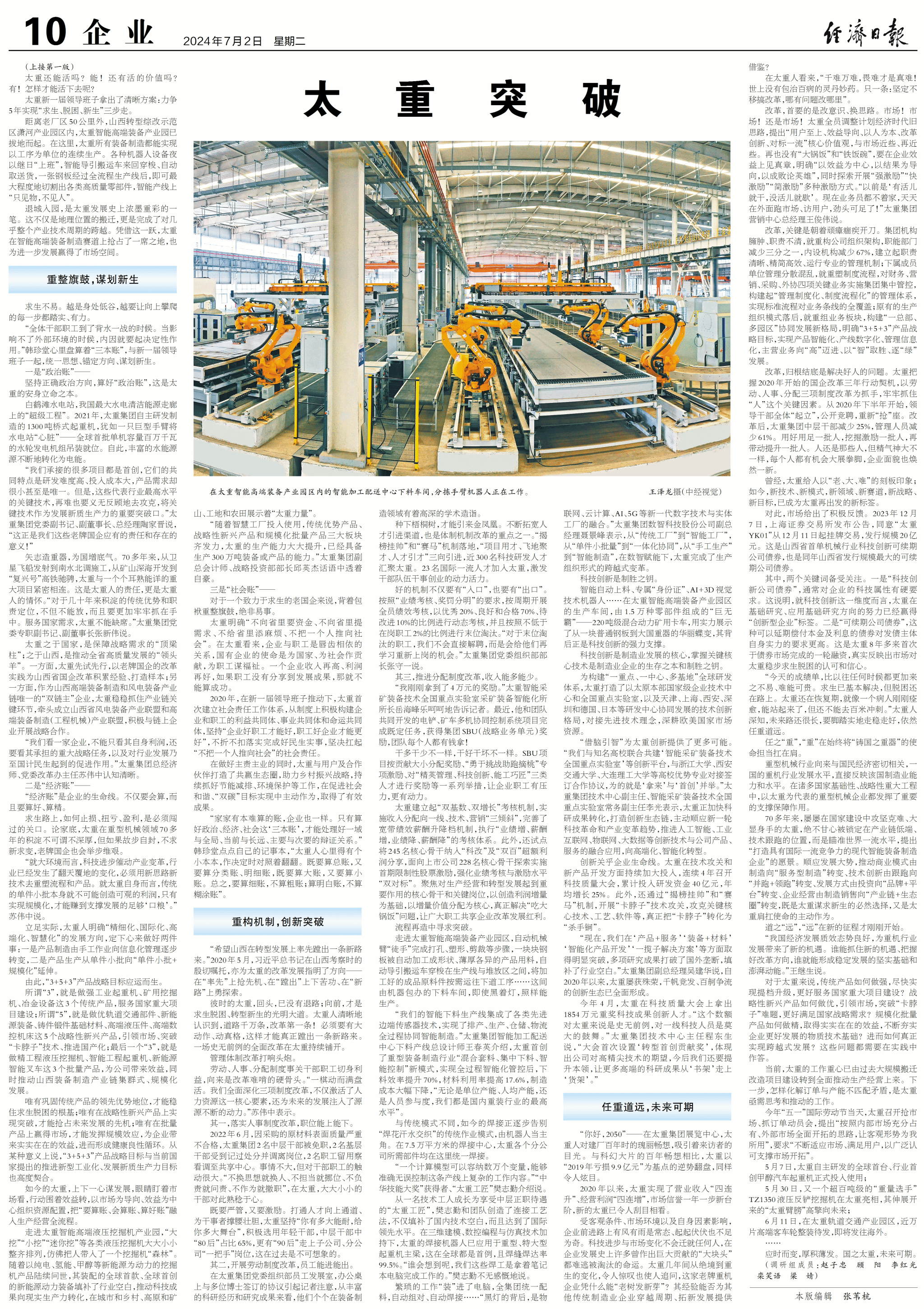 今日,《经济日报》在【牢记总书记的嘱托·企业调研记】专栏刊发文章《太重突破》,头版头条、万字报道,以太重之变、之最、之智、之绿、之速,展示太重以科技创新推动产业创新的先进做法,介绍太重推动制造业振兴崛起、实现“老树发新芽”的先进经验。
