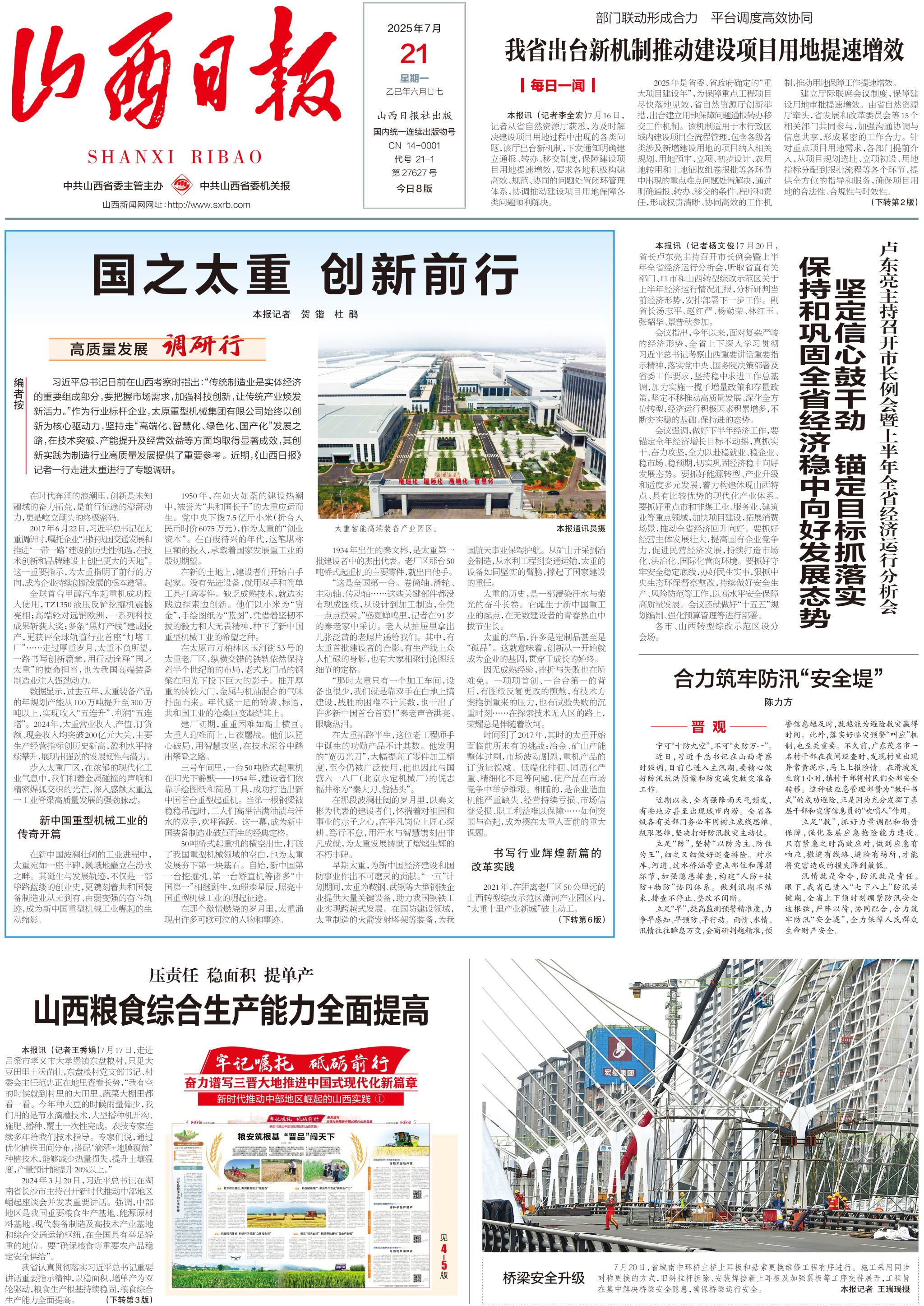 今日,山西日报【高质量发展调研行】专栏刊发重磅文章《国之太重 创新前行》,头版头条深度聚焦“共和国长子”奋进足迹,触摸七十载不变的强国初心,展示新时代太重奔涌不息的创新脉动!