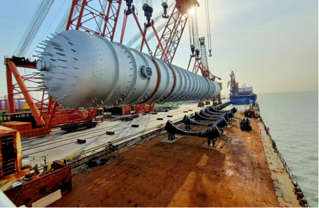 发力超大型石化压力容器市场太重承揽浙江石油化工有限公司总投资1730亿元建设的4000万吨/年炼化一体化项压力容器建造。该项目投资额超越了浙江省其他10个地市各自的投资总额。列入《石化产业规划布局方案》的重点项目,对促进全国石化产业转型升级、发挥民营经济力量、带动地方经济具有重要意义。图为:浙江石油化工有限公司4000万吨/年炼化一体化项目二氧化碳吸收塔发运: