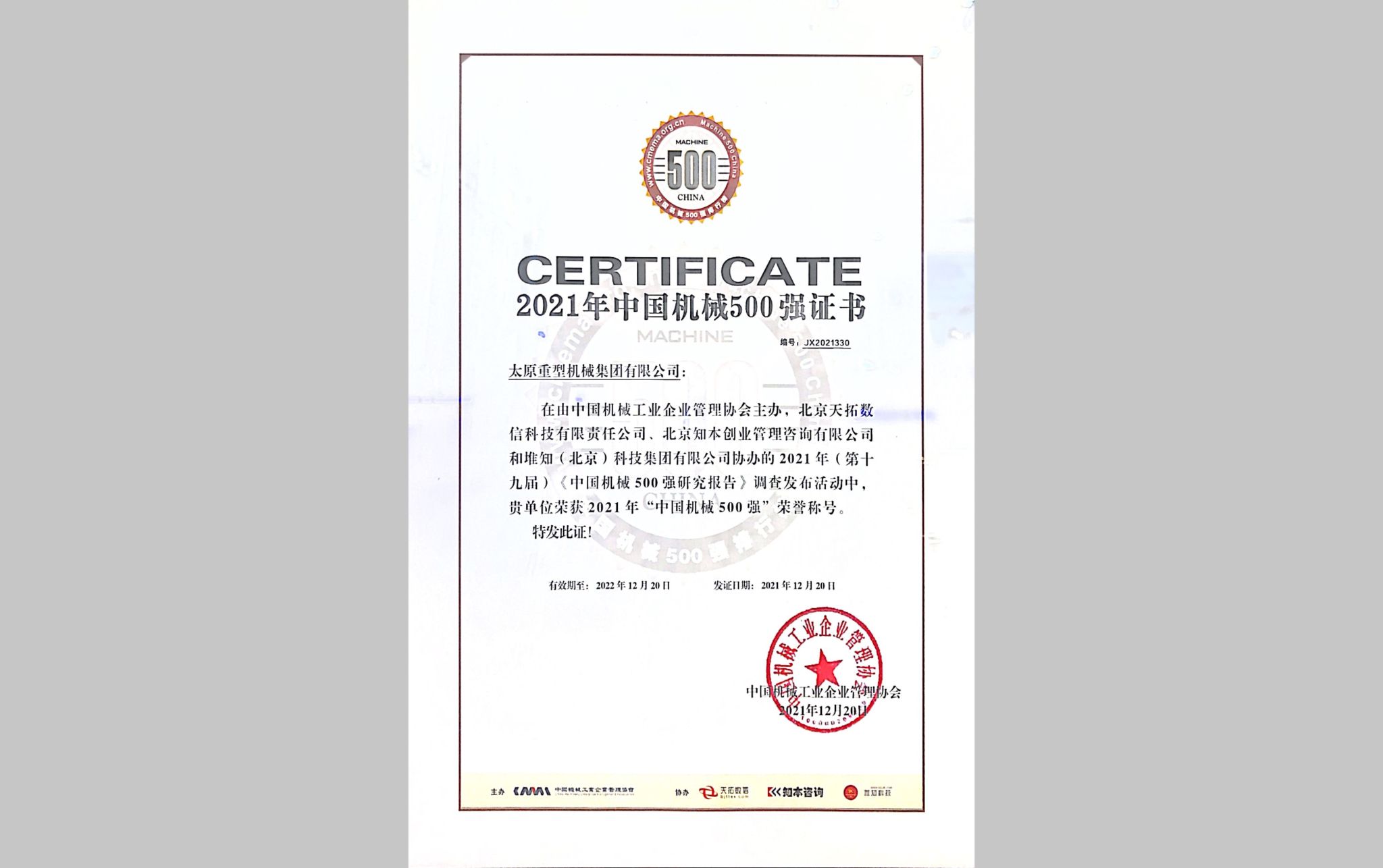 2022年12月21日,全球暨中国机械500强研究报告发布会在陕西西安举行,太重集团凭借优异表现和雄厚实力继续蝉联上榜,并跃升至第242位。
